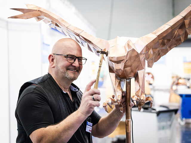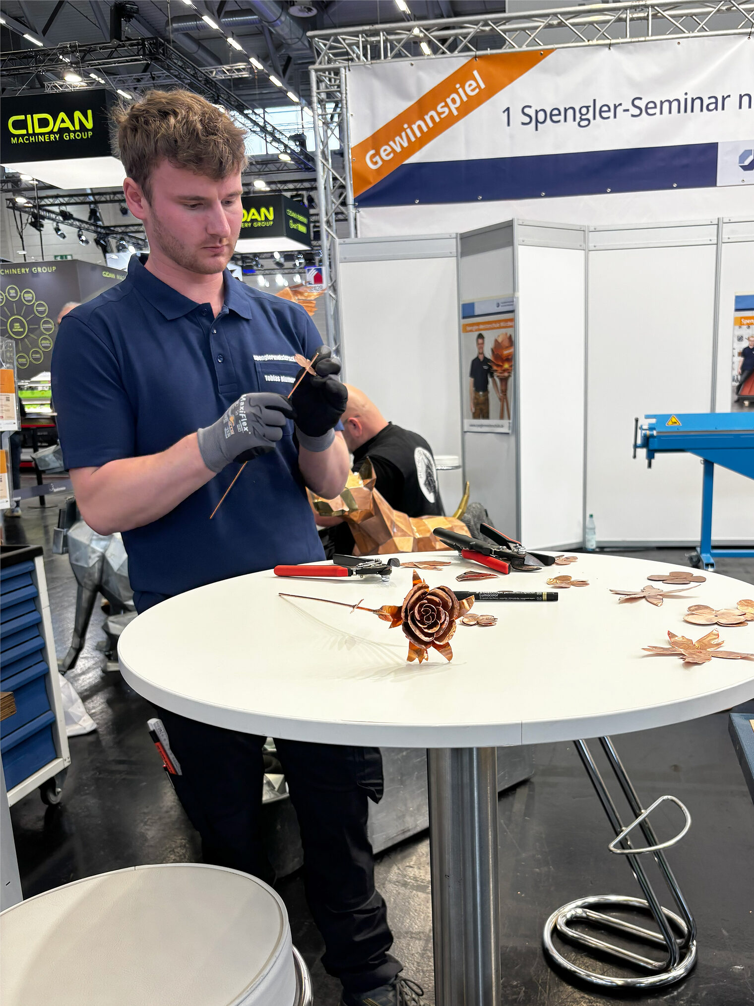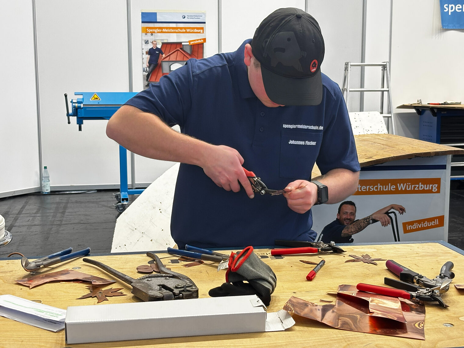Am Stand 428 in Halle 8 präsentierten die Meisterschüler der Spenglermeisterschule die ganze Vielfalt des Spenglerhandwerks: von der Anfertigung eines Wandanschlussfalzes (Bündnerfalz) über Faltenkehlen und gerundete Maurerabdeckungen bis hin zu kunstvoll gestalteten Origamis und handgefertigten Spenglerosen. Die Live-Anfertigungen boten spannende Einblicke in das Spenglerhandwerk und zogen kontinuierlich Besucher an.