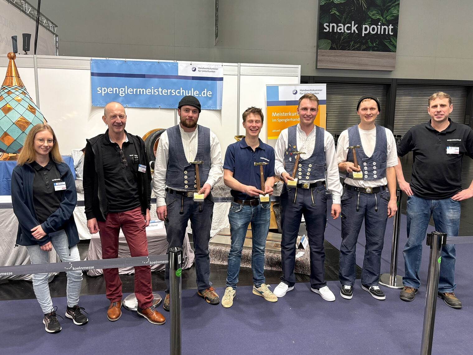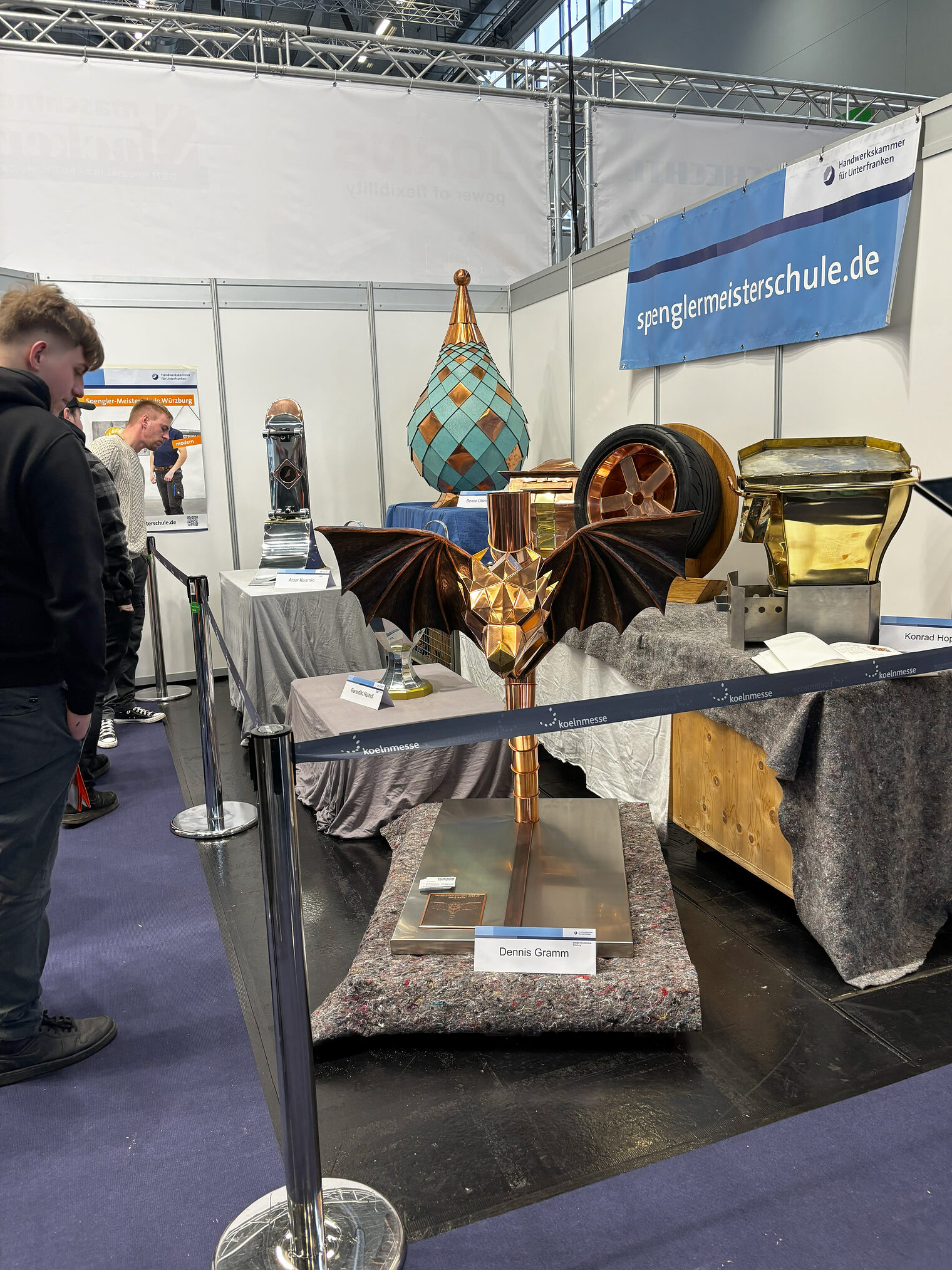 Am 1. Messetag, den 24.02.2026, verlieh das Fachmagazin BAUMETALL im Rahmen des Leserwettbewerbs „Meisterstück des Jahres" den Goldenen Hammer – die Prämierung der besten Spenglermeisterstücke aus 2024 und 2025. Vier dieser ausgezeichneten Werke stammten von Meisterschülern der Spenglermeisterschule Würzburg: Luca Schmid mit einem Bierfass mit Zapfanlage, Sales Bär mit einer Blechtrommel, Dennis Gramm mit einem Drachenkopf und Artur Kusmin mit einem Skateboard mit Minirampe.